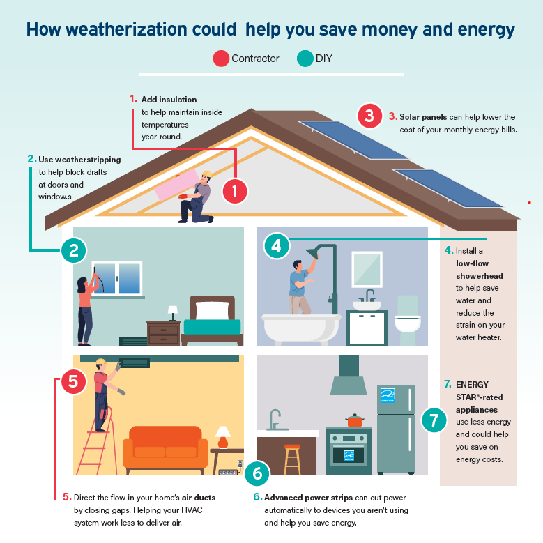 Weatherization helps keep your home comfortable and may help lower your utility bills. The FREE assessment and qualifying upgrades may include air sealing, HVAC tune-ups, pipe insulation and added insulation in walls or ceilings.