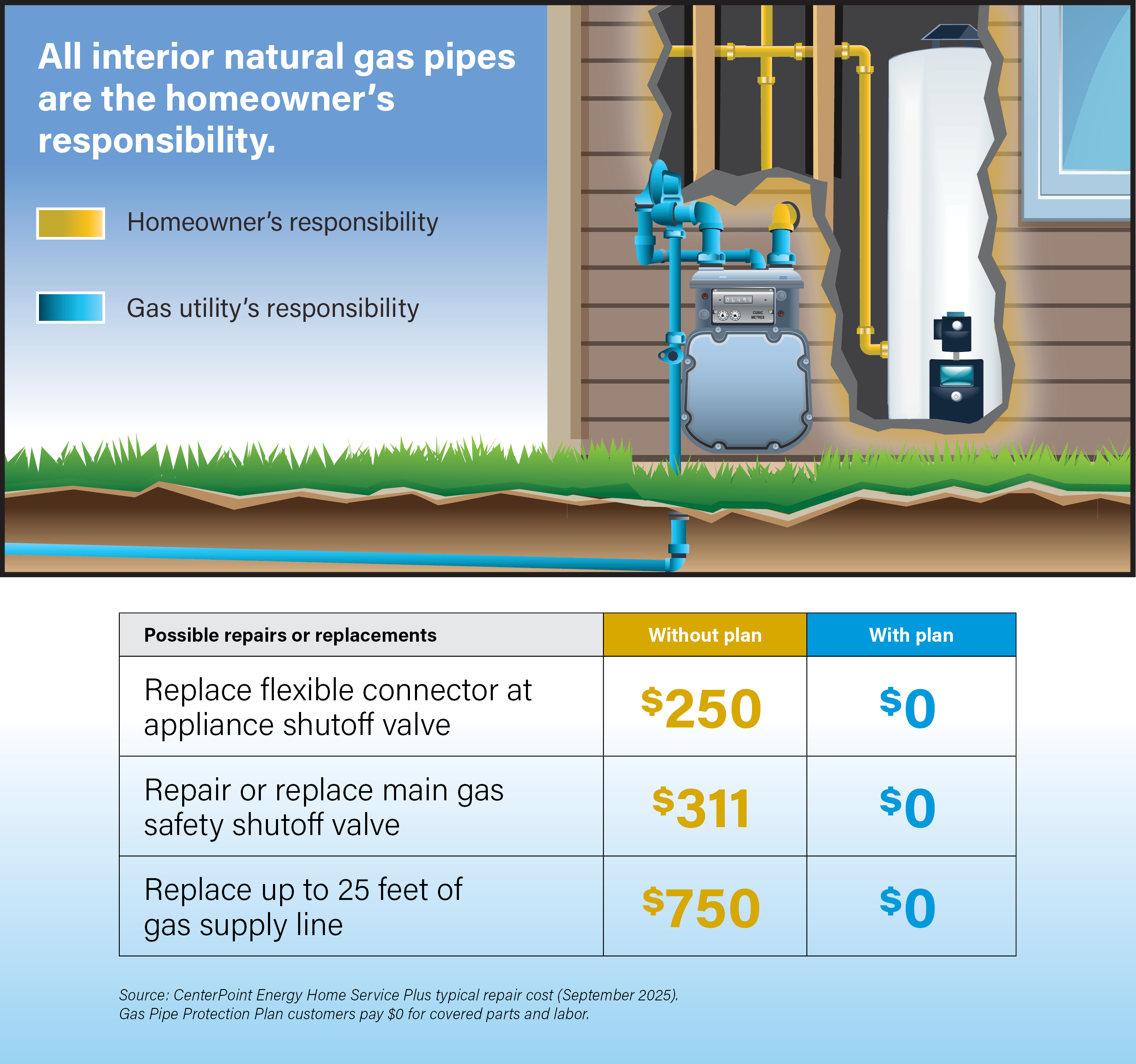 CenterPoint Energy's Home Service Plus offers you an optional Gas Pipe Protection Plan for only $5.95 a month. It covers interior, readily accessible, natural gas pipes running from the gas meter to your natural gas appliances.