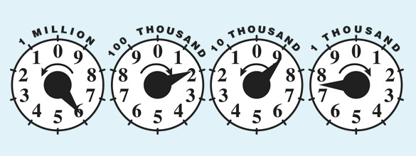 Read the meter dials left to right. If a hand is between two numbers, always read the smaller number except when the hand is between zero and nine, in which case you read the number nine. In the illustration above, dial 1 reads "6", dial 2 reads "1", dial 3 reads "8", and dial 4 reads "7". The correct reading for this meter is "6187".
