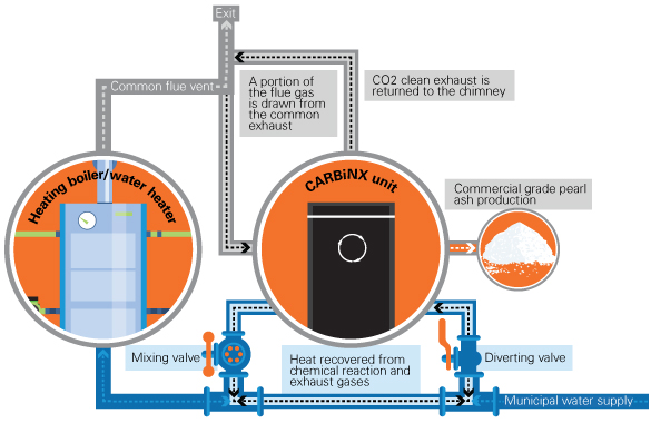 Each CARBiNX device, which is about the size of two mid-sized refrigerators, is attached to natural gas-powered boilers or water heaters to reduce both energy use and greenhouse gas emissions. The device takes a portion of waste flue gas containing CO2 and passes it through a reaction chamber, where it reacts with a carbon-reduction chemical to create pearl ash. This valuable byproduct can be used to produce hand soap, fertilizer, and other commercial products where the CO2 will stay captured even after use. Waste heat from the flue gas and chemical reaction is then used to preheat water for a water heater.